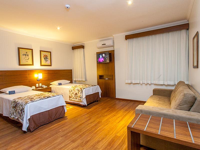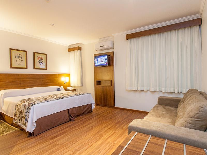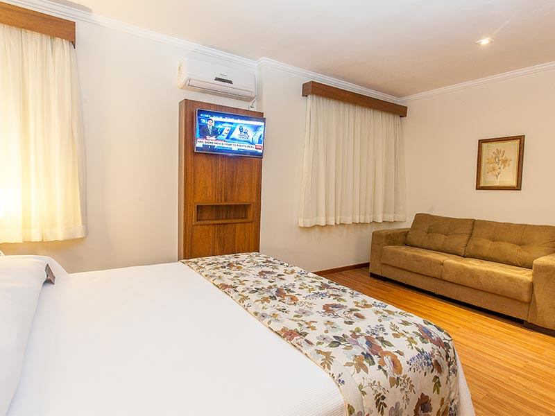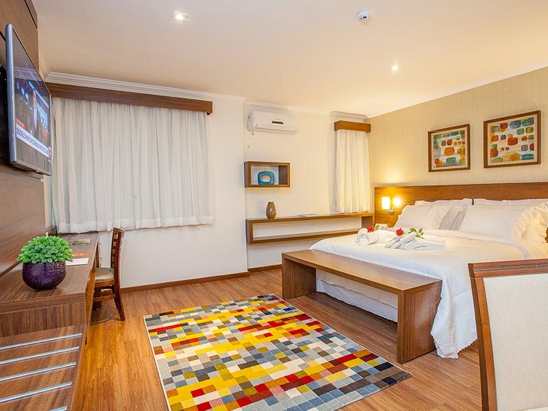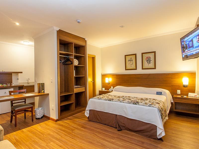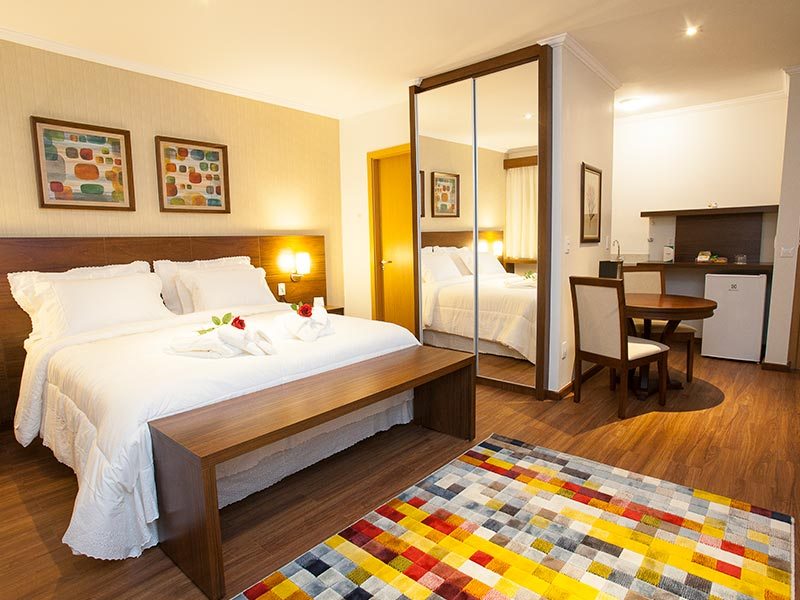 O apartamento possui uma cama casal, 30 metros quadrados, minibar, ar condicionado, fechadura eletrônica, serviço TV a cabo, cofre e internet WI-FI inclusa na diária. Cafeteira Nespresso e chaleira, com capsulas, chás, e 1 água de cortesia. Enxoval diferenciado.